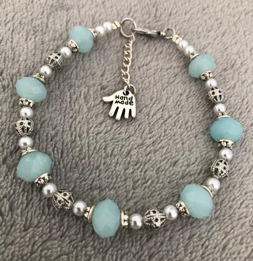Light Blue Glass Beads With Caps And Metal Patterned Balls With Small White Pearls