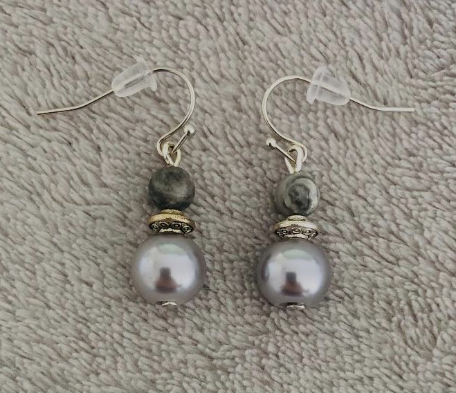 Light Pearl Bead With A Mottled Grey Stone And A Silver Spacer With French Hooks